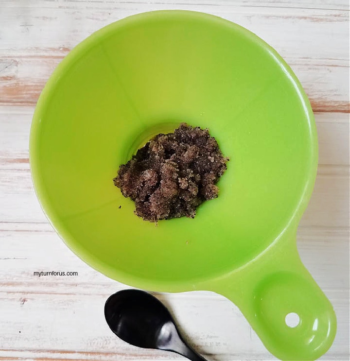 - In your glass bowl add the sugar, coconut oil and essential oil, and stir well to combine. Then add your coffee grounds and stir until the grounds are evenly mixed.