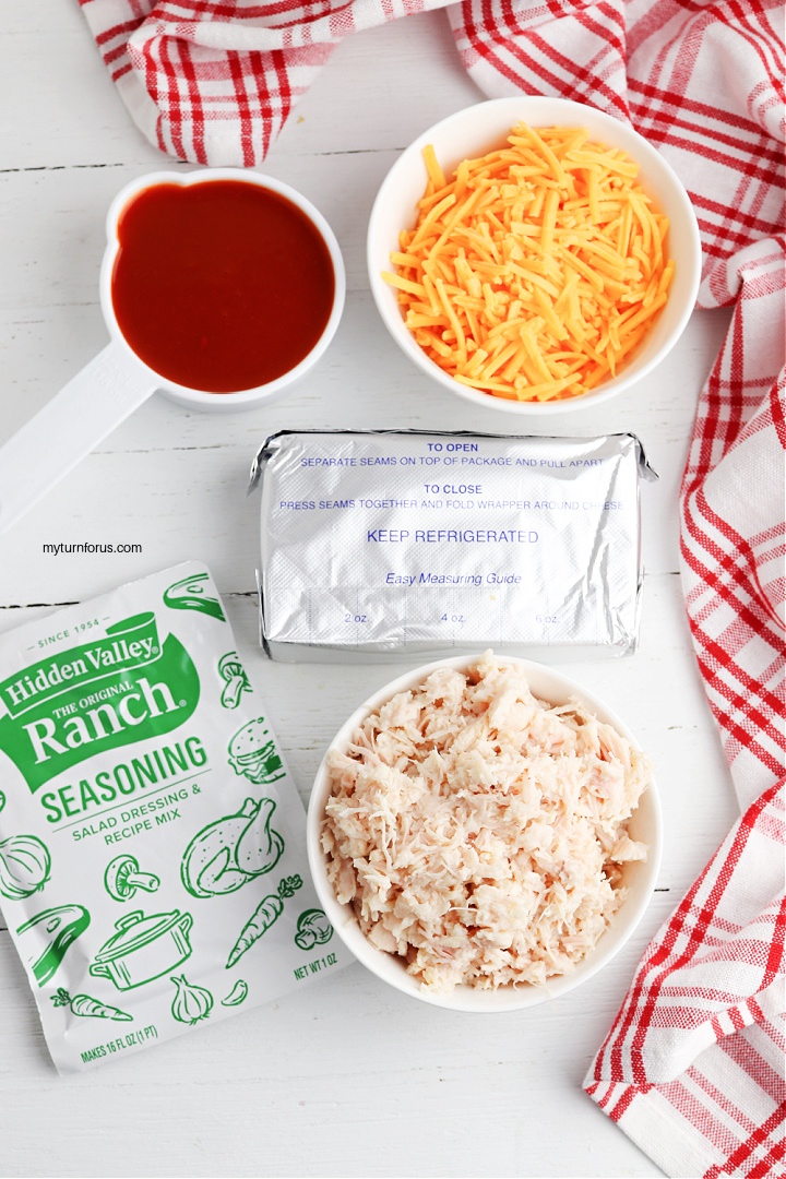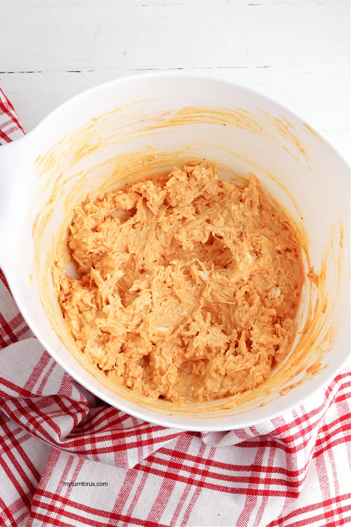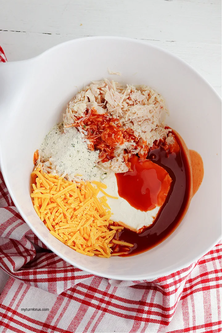 • In a medium mixing bowl add the cream cheese, chicken, cheddar cheese, buffalo sauce, and ranch seasoning.