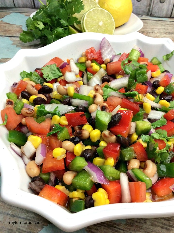 Make this cowboy salad or as some of my friends call it, hillbilly caviar with some basic ingredients that add a variety of color and flavor. And you season it with a zesty dressing and plenty of salt and pepper. It is perfect for any picnic or cookout.