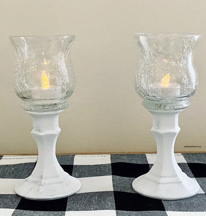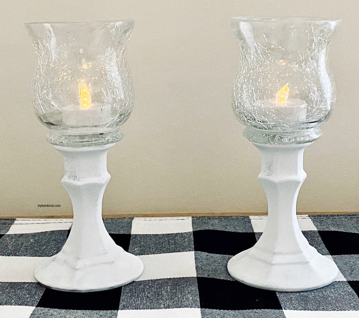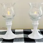 A set of two of these dollar store candle holders will cost you under $5.00. It’s takes very little paint and only a few dabs of glue. We have a a battery tea light in them which you can pick up very inexpensively. But the sky is the limit with these Farmhouse style pedestal candle holders.