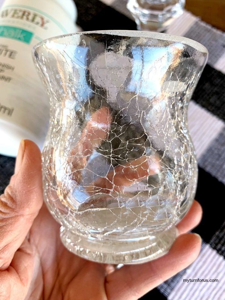 We found these little crackle glass candle holders at our local Dollar Tree. But we only found four of them at the time and we are on the lookout for more. We had to dig to the back of the shelves in the candle votive section of Dollar Tree to find them. So if you are checking your local store, be sure and search all the shelves for them.