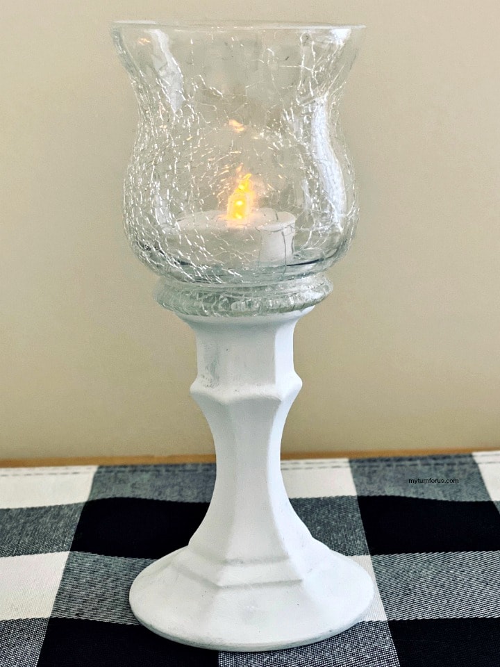 Now either add a battery operated candle or a small votive candle. And decorate your dollar tree pedestal candle holders with greenery or ribbons to match your decor or use a holiday decor. And this crackle glass candle holder makes one oof the most elegant candle holders don’t you think?