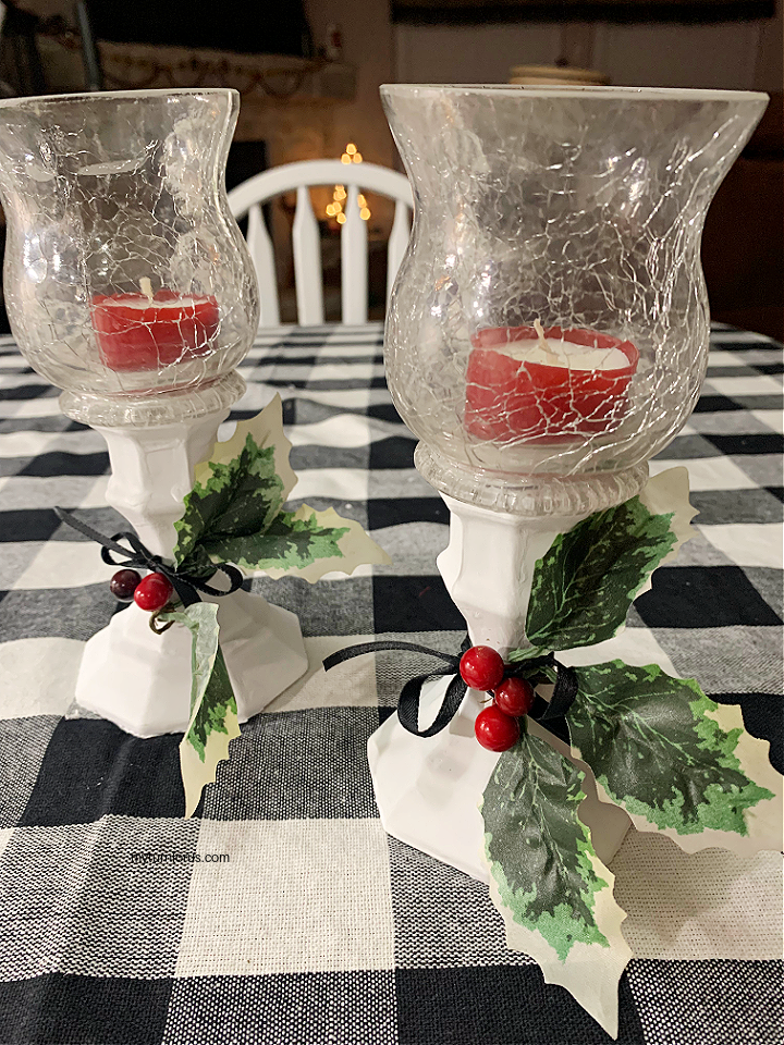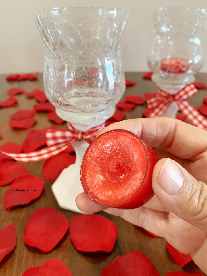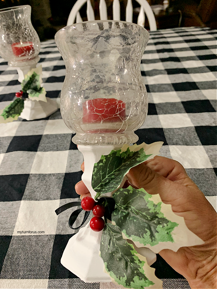 If you are decorating for Valentine’s Day you might wish to tie a colorful ribbon, (we used red gingham) around the candle holder pedestal. Or you could use pink and red ribbons.
