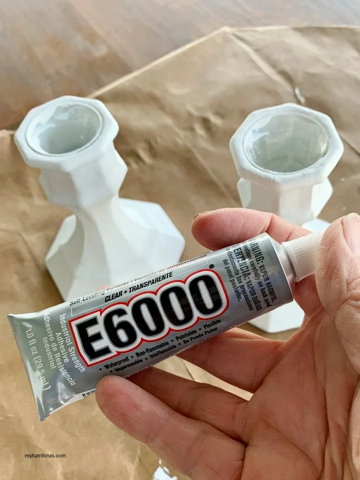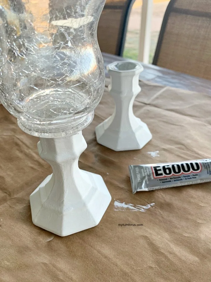 - To attach the crackle glass candle holder to the pedestals you will need e6000 glue. It’s transparent and bonds to glass, wood, plastics, tin, metal, ceramic, cement, rubber, vinyl, leather, fabric