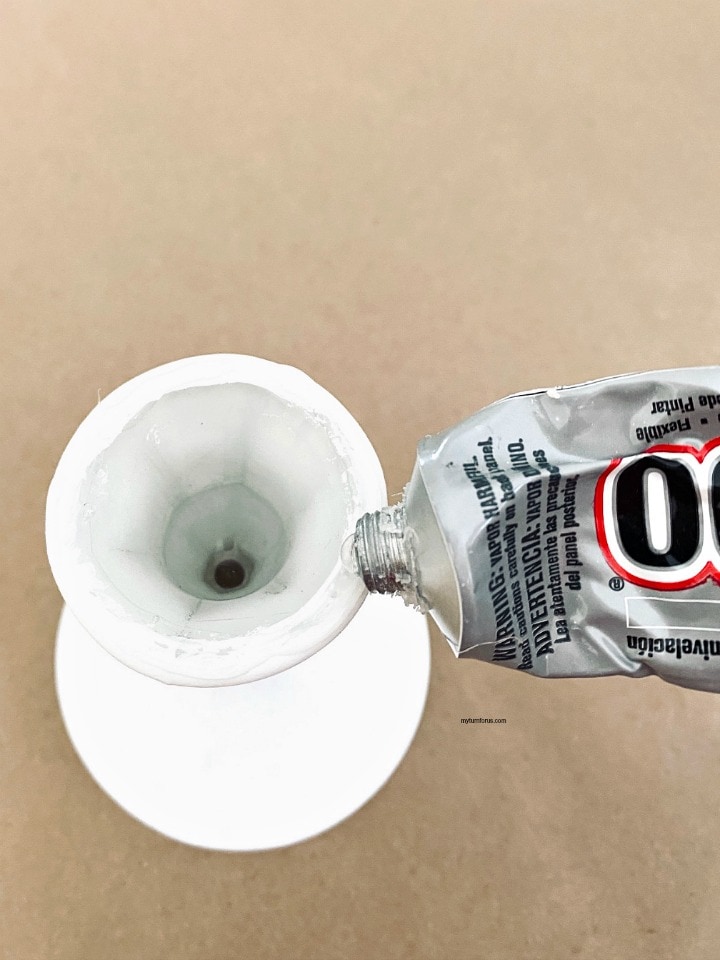 To attach the crackle glass candle holder to the pedestals you will need e6000 glue. It’s transparent and bonds to glass, wood, plastics, tin, metal, ceramic, cement, rubber, vinyl, leather, fabric
