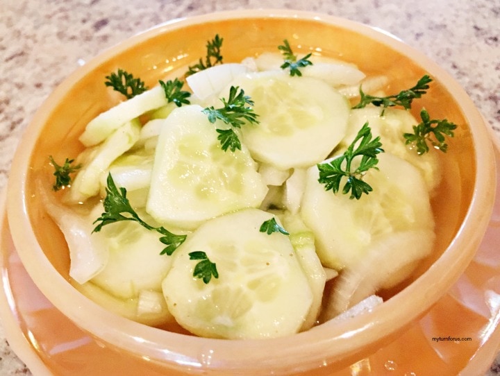Right now my garden is producing the best cucumbers and it’s too hot to pickle them so we are enjoying this cool fresh side dish.  These marinated cucumbers make a great picnic dish or potluck side.