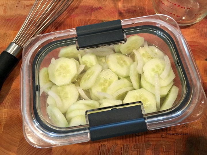 Pour the marinade over the cucumbers, cover, and place in the fridge overnight or for at least four hours. We love these Rubbermaid Brillance containers, they seal well, leakproof and come in several sizes.
