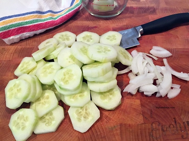 Start your marinated cucumbers by slicing the cucumbers with a sharp knife or a mandolin.  Slice about 1/4 cup of white onions.