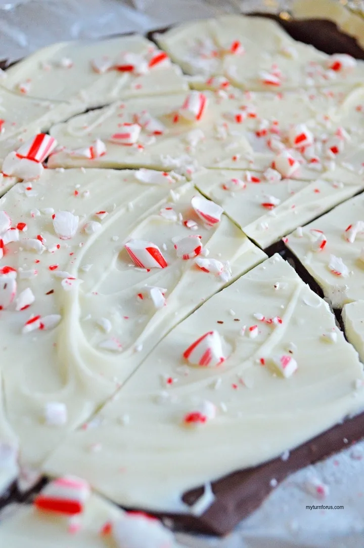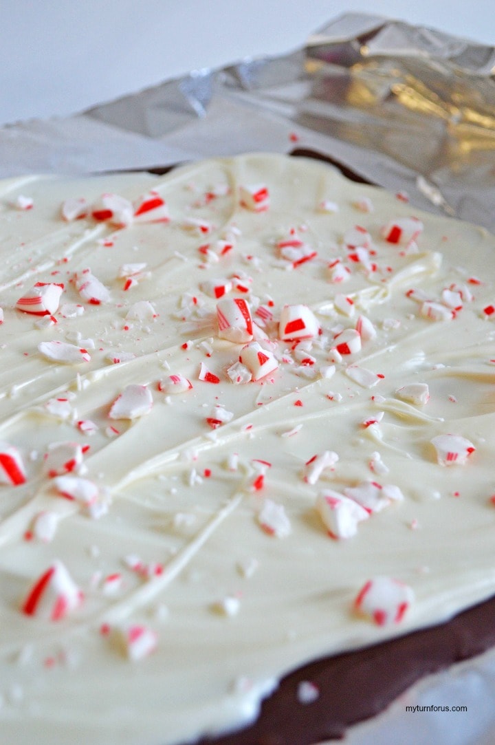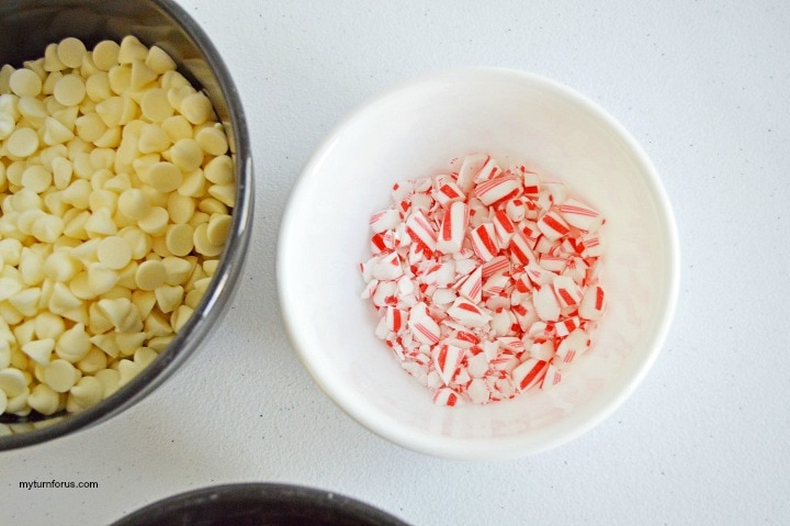 - Sprinkle crushed/chopped candy canes over top of the white chocolate.