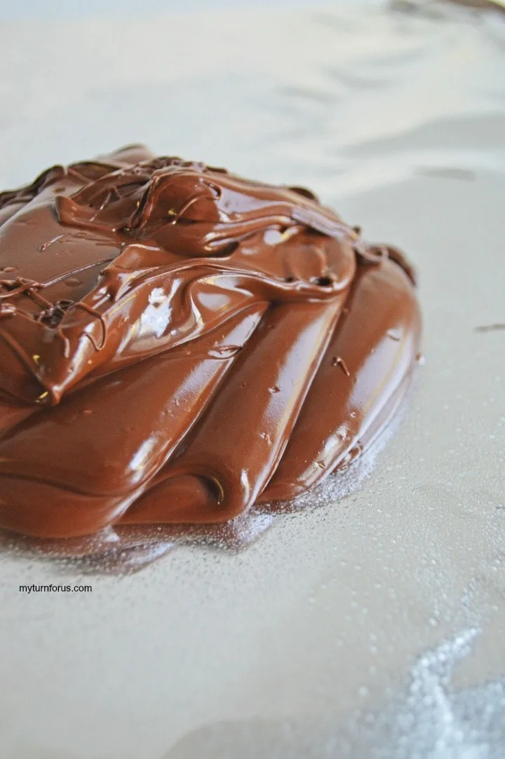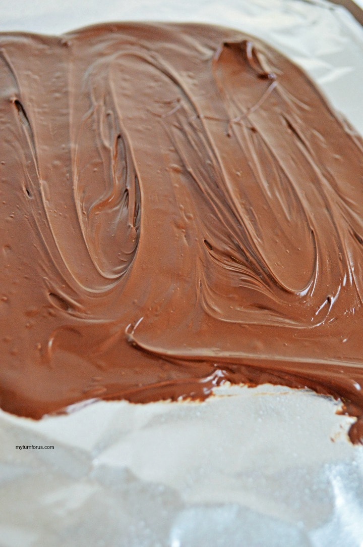 - Pour the dark chocolate into a thin single layer on your baking sheet, smoothing out with a spoon.