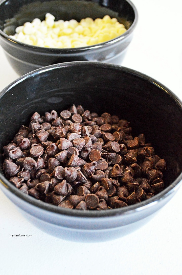 After the dark chocolate has frozen, place the bowl containing white chocolate chip into the microwave. And microwave the chips on 20-second intervals, stirring well in between, until melted.