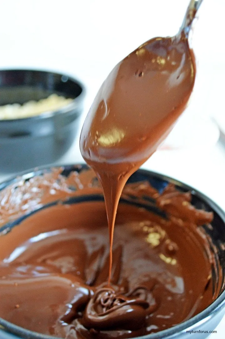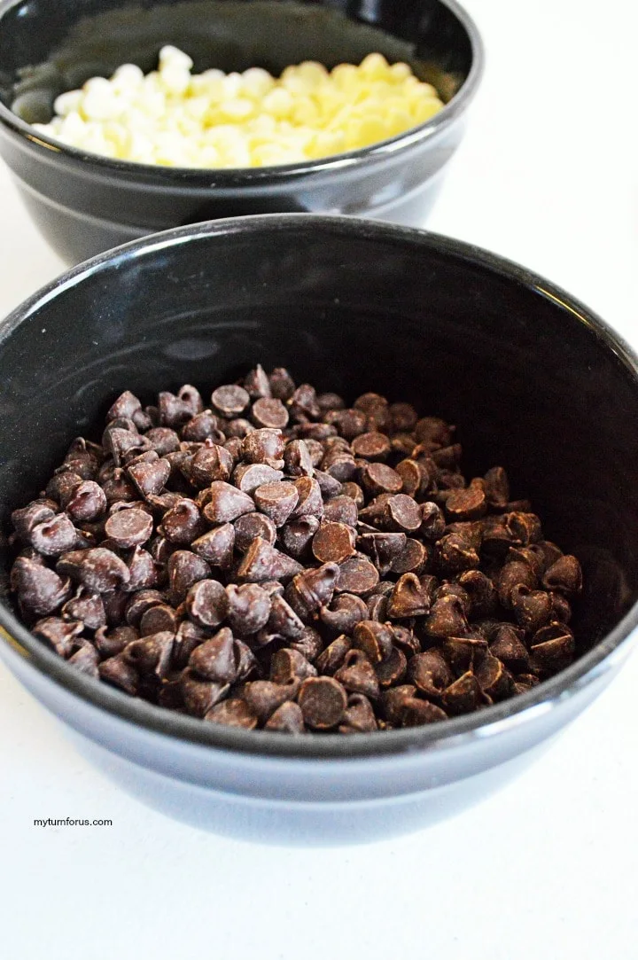 Place the bowl of dark chocolate into the microwave and microwave on 20-second intervals, stirring well between, until melted. Or you could use a candy melting pot to melt the chocolate chips for convenience.