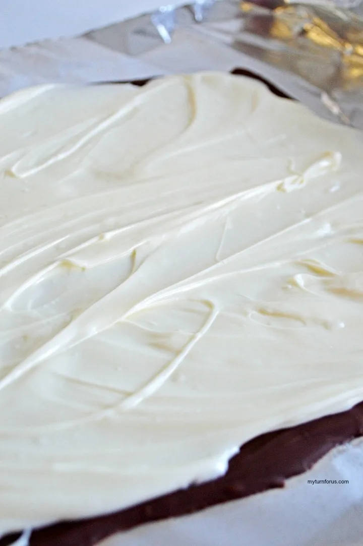 - Pour the white chocolate over the semi-sweet, smoothing out into a thin layer with a spoon.