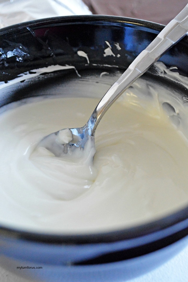 - After the dark chocolate has frozen, add the white chocolate chips to another microwave-safe bowl. Microwave on 20-second intervals, stirring well in between until melted. or use a Candy Melting Pot.