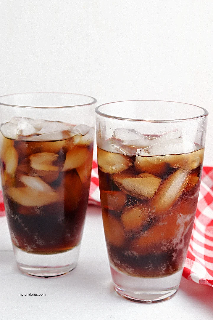 - Fill 2 glasses full of ice and evenly divide the 12 ounce Diet Coke between the two glasses.