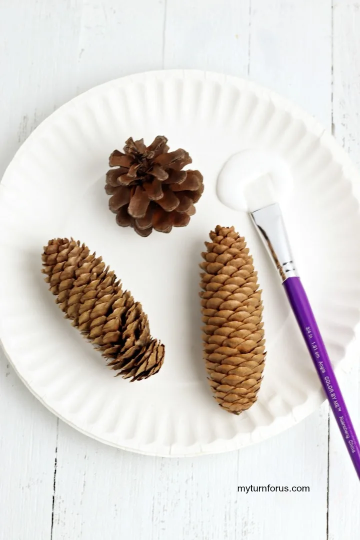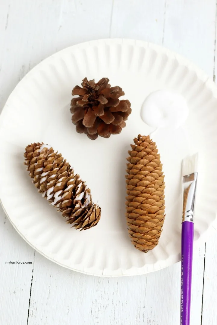 - After following the steps above on how to clean pine cones. Place your clean and dry pinecones on a paper plate for easy cleanup. Pour a puddle of white glue on one side of the plate.