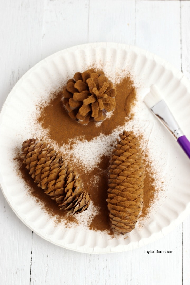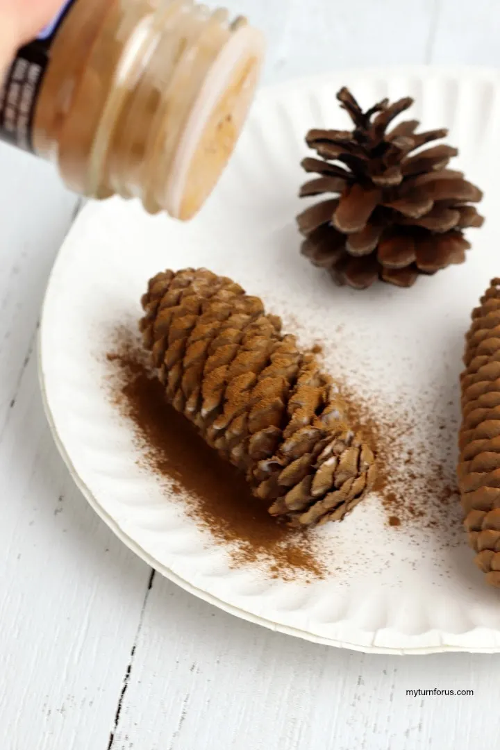 - Sprinkle cinnamon liberally over the pinecone, making sure to cover all the wet glue. Then roll the cones over and cover all the other sides making sure all of the cone is covered with cinnamon.