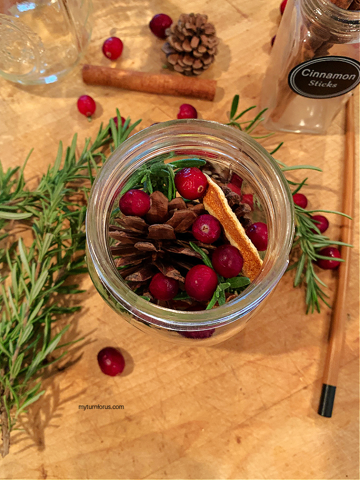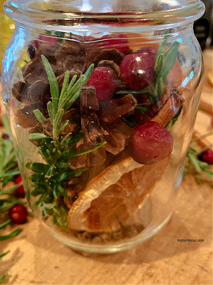 Adding Rosemary to the pinecones, orange slices and cinnamon sticks in a mason jar