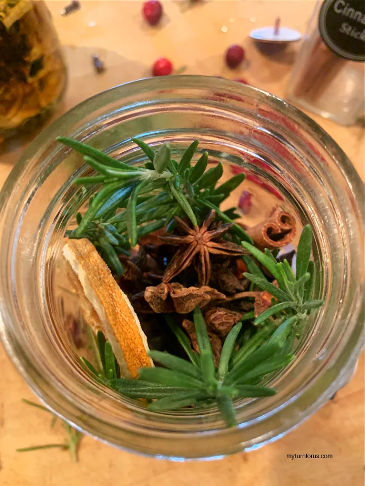 Tuck in a few star anise pods, whole cloves, and fresh rosemary sprigs (or any greenery you love) around the orange slices and pinecones. Pack everything snugly so the pieces stay beautifully in place once the oil is added.