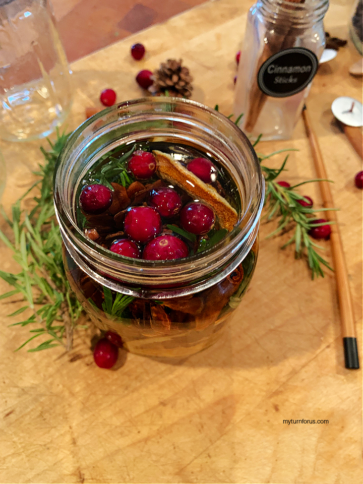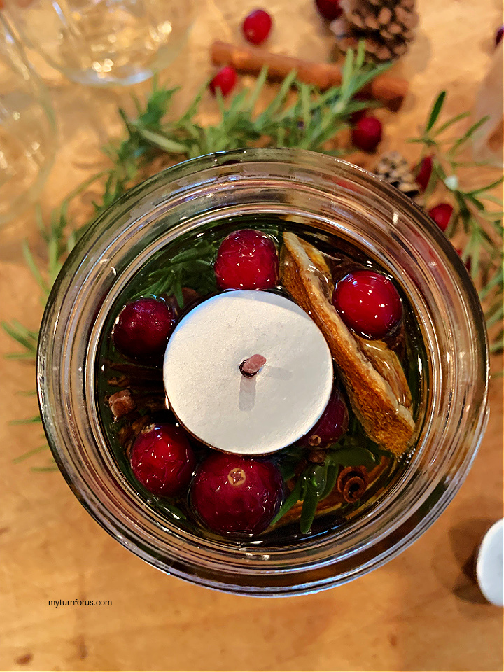 • Carefully fill the mason jar oil lamp with light olive oil then add several drops of your choice of essential oil and stir. The cranberries will float to the top, you can push some of them down under the other items to hold them. But it’s ok to allow some of them to float.