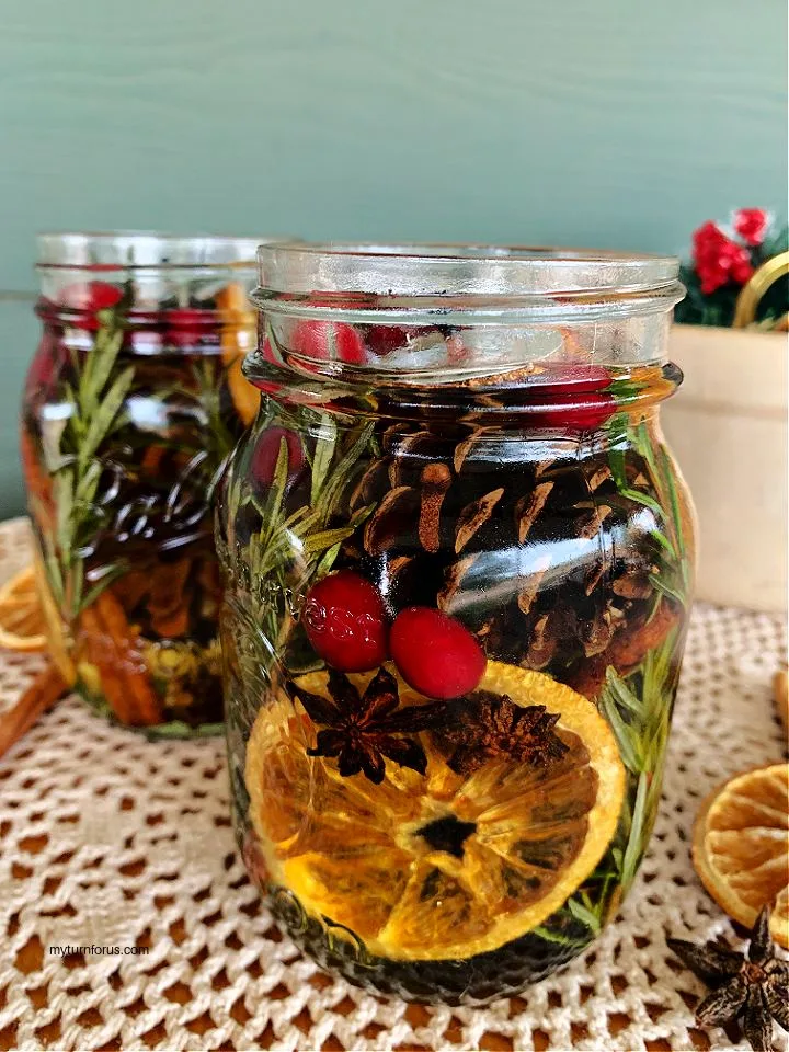 • Tuck in a few star anise pods, whole cloves, and fresh rosemary sprigs (or any greenery you love) around the orange slices and pinecones. Pack everything snugly so the pieces stay beautifully in place once the oil is added.
