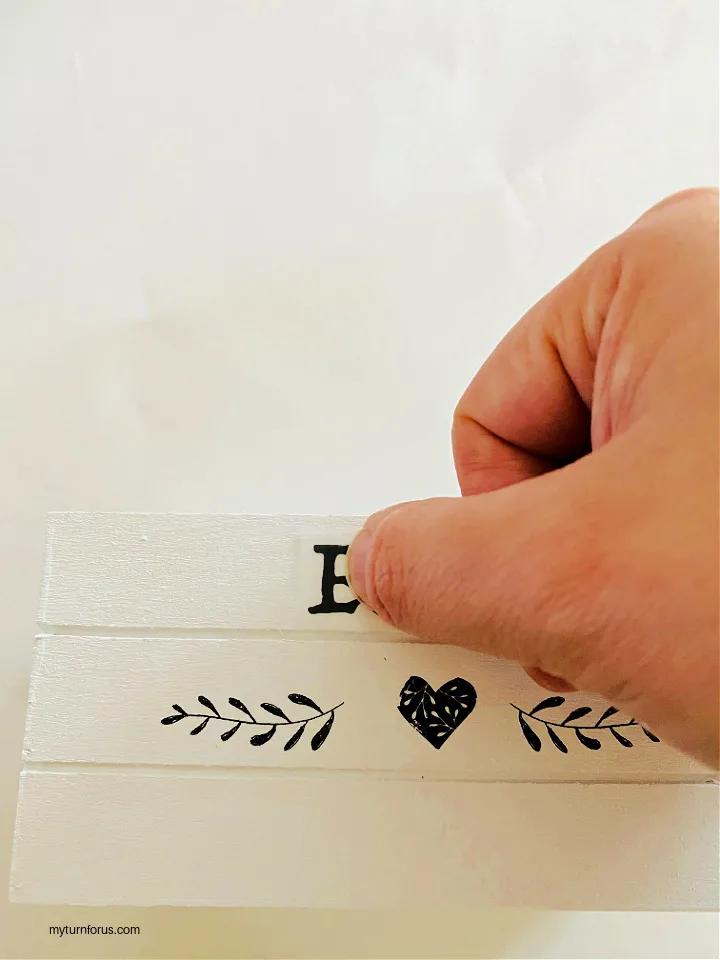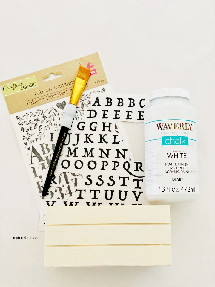 Place each letter on your farmhouse recipe box, centering them and lining them up evenly. Rub using a firm, smooth pressure with something like a clean, dry, Popsicle stick or you could use your fingernail if you are careful.