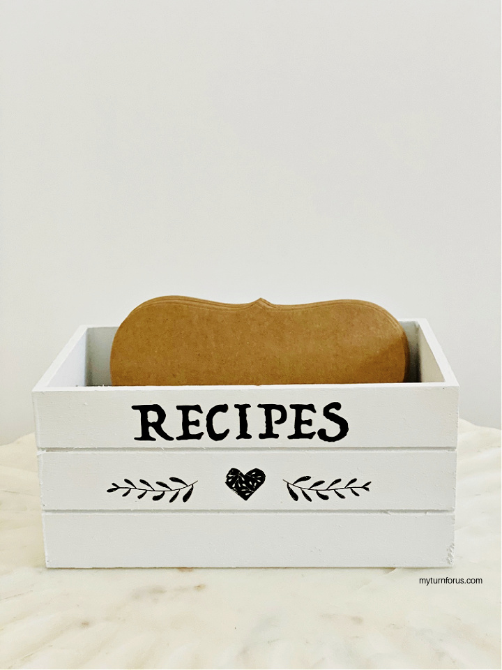 The longer these rub on letters set they more durable they are but you might wish to seal this with a clear coat of acrylic. Now you can fill them with 3 X 5 blank or personalized recipe cards. It’s also a nice touch to handwrite a few of your family family recipes and add to this when giving it as a gift.