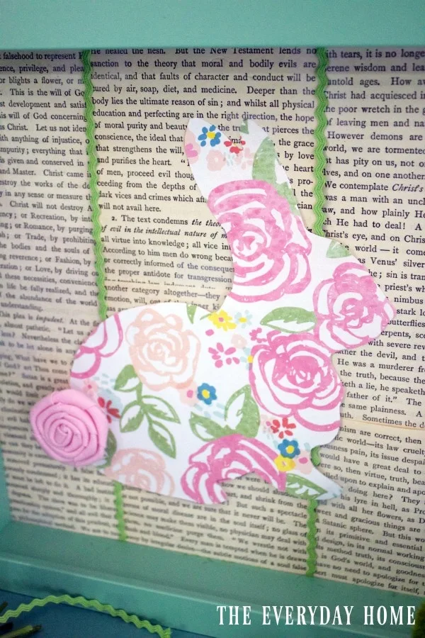 There are so many variations for this Scrapbook Bunny Art with free downloadable Bunny Silhouette Printable.  You could use scrap paper and old books or go with a traditional silhouette black bunny on colored paper