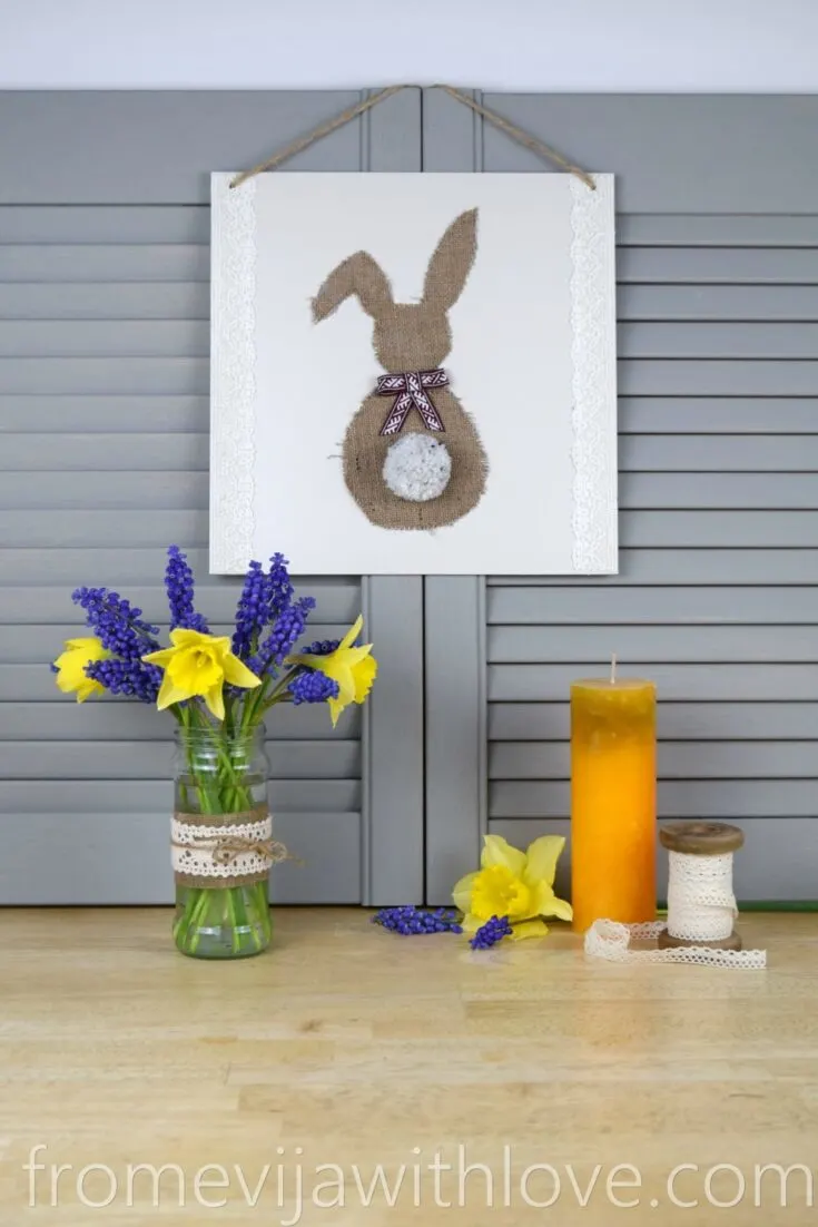 This Rustic Easter Bunny Hanger Sign is made from burlap for a farmhouse look.  You could use any shape plaque or wood sign and add the three-dimensional bunny. Â