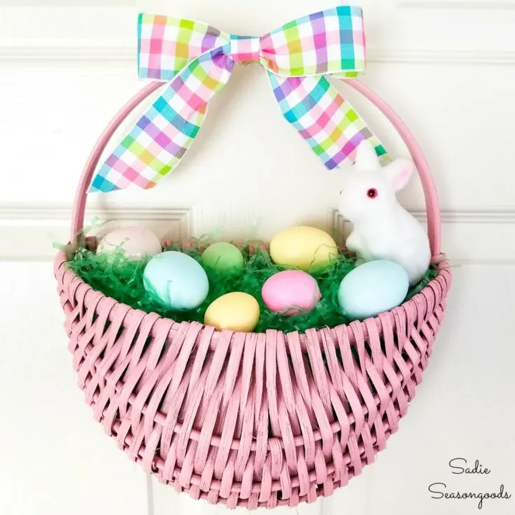 Upcycle an existing basket and use this clever way to make those eggs stay in the basket for a super cute Easter Basket Wreath.