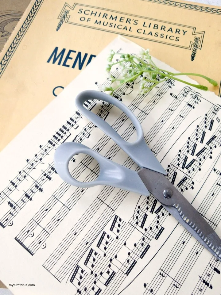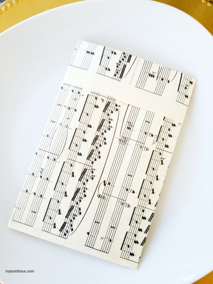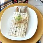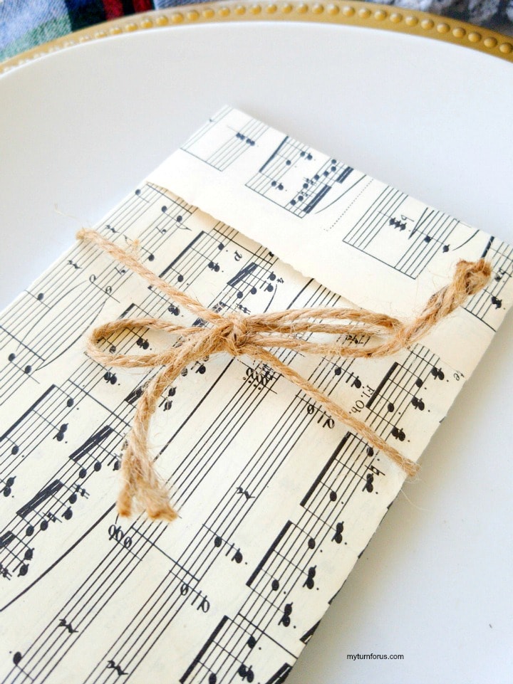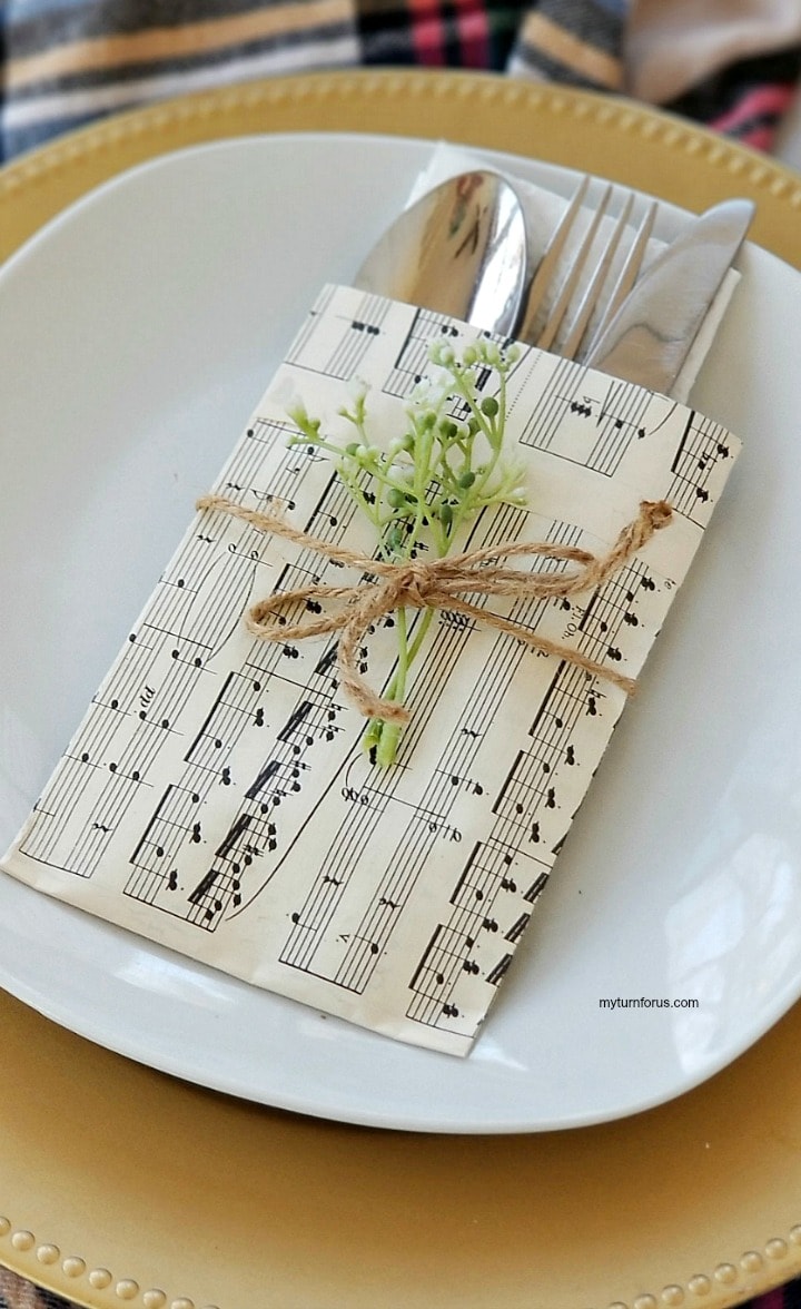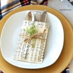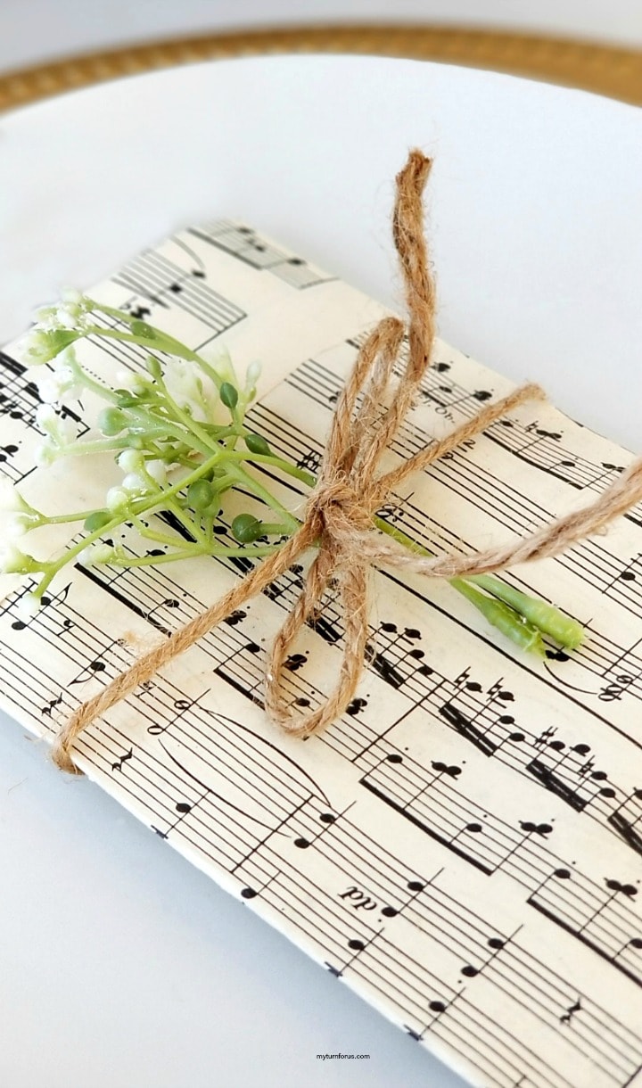 Any of your favorite songs would make your family dinner very special on any night of the week.   Mix craft with class by creating these Vintage inspired sheet music cutlery pouches!  They’re not just a beautiful addition to your table setting, but also a great conversation starter. Make any dinner special by personalizing the music sheets to match your theme. It’s an effortless way to add a personal touch to your table setting.   And you don’t have to set a formal table to enjoy these music paper cutlery pouches, you could package the silverware and place them in a basket for a buffet style setting.