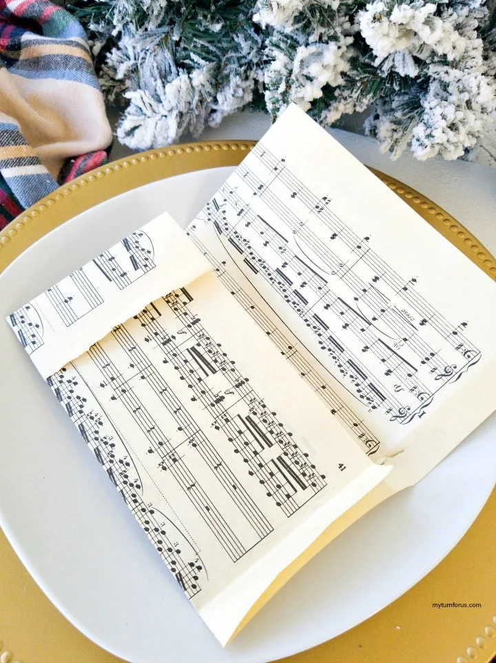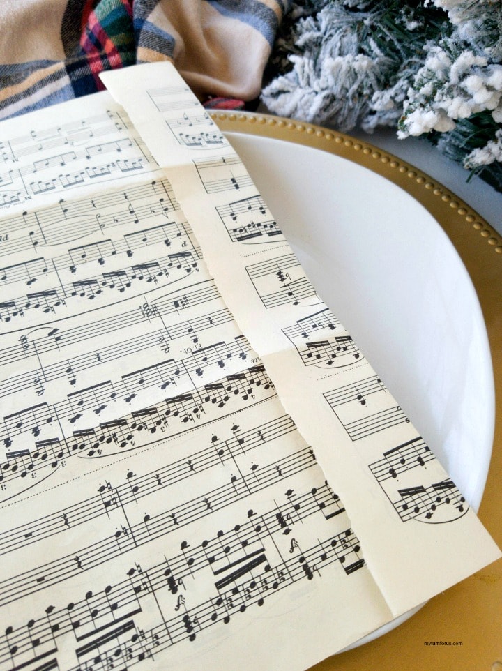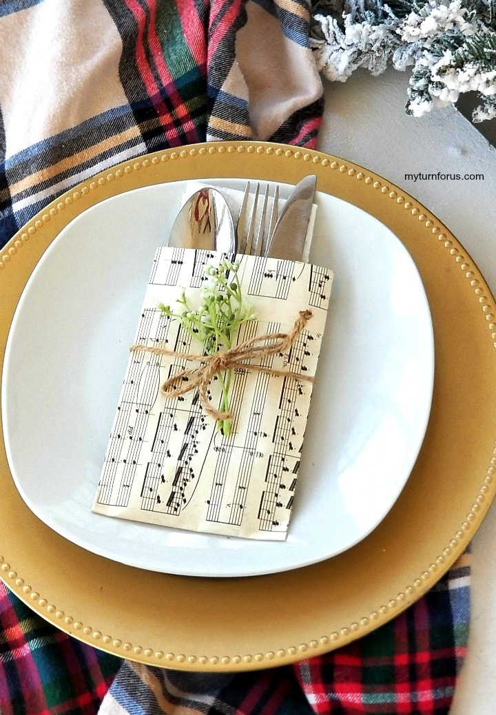 This is such an elegant table setting that cost almost pennies.  In fact we didn’t pay a penny for ours since we had all the materials in our craft room.   And it only took us a couple hours to make several of these sheet music place settings for all our Christmas Dinner guests.   And there are so many variations for these vintage inspired sheet music pouches simply by changing it up a little.