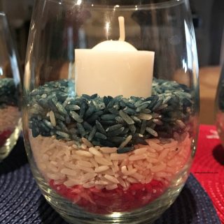 Start with the red rice, pour 1/3 cup of the red colored rice into the vase and level it out. Add the undyed white rice and top with the blue colored rice.  Add a votive or tea candle on top.