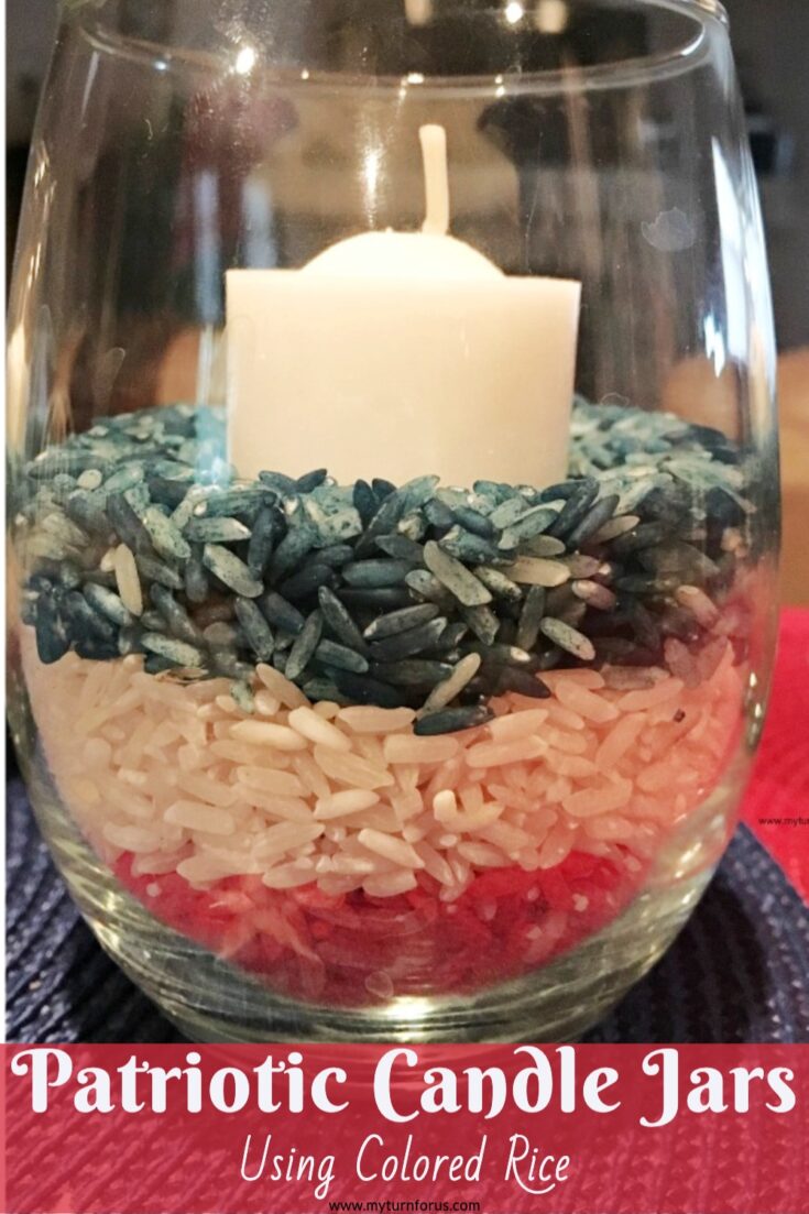 These inexpensive and easy Patriotic candle jars are made using colored rice or dyed rice. Most everything we used we gathered around the house