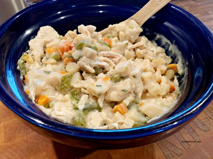 Often called Veg-All Chicken Pot Pie, it gets its hearty veggie mix from two cans of Veg-All—those handy cans packed with corn, carrots, potatoes, green peas, celery, green beans, and lima beans. Toss in shredded chicken and a couple of pie crusts, and you’ve got pure comfort food magic with almost instantly. Everyone always begs for seconds!