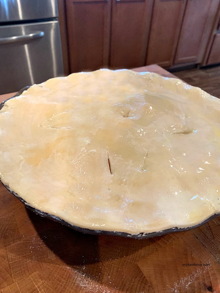 • Brush the top lightly with egg wash (one egg beaten with a splash of water) and cut a few slits in the center to let steam escape.