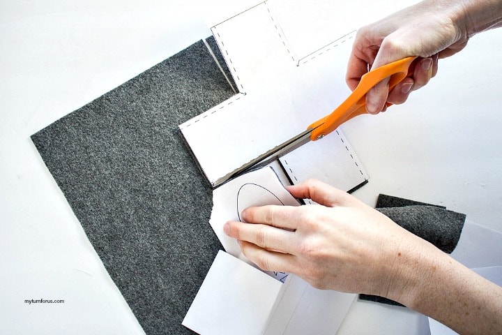 - Using fabric scissors, cut the large box pattern and basket handle in charcoal felt. Clip all four inner corners of the box pattern. Put aside.