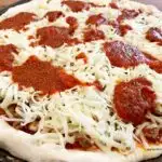 • Either purchase a pre-made pizza dough round or make it from scratch using our basic pizza dough recipe.  Place the pizza dough on a pizza pan and spread a think layer of the Homemade Pizza sauce on top.