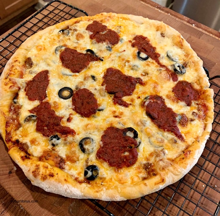 This is enough pizza sauce for two pizzas and it can be used sooner but it is better when given at least 24 hours for the flavors to marry