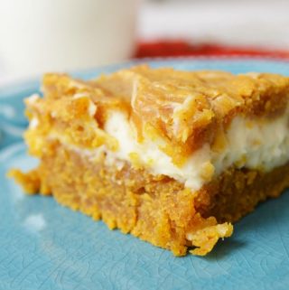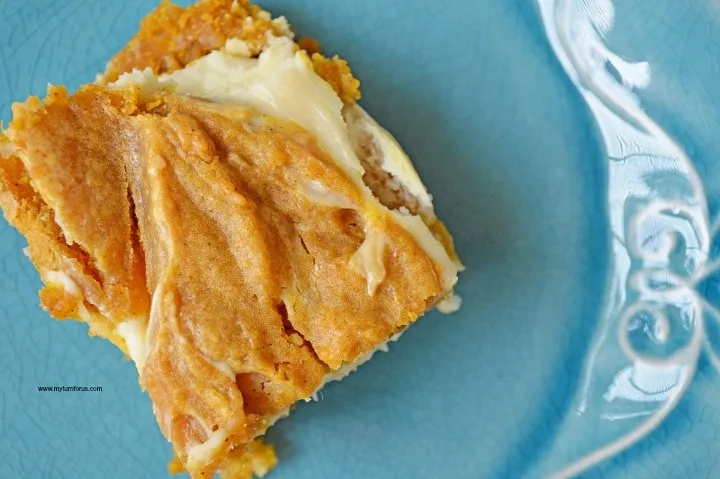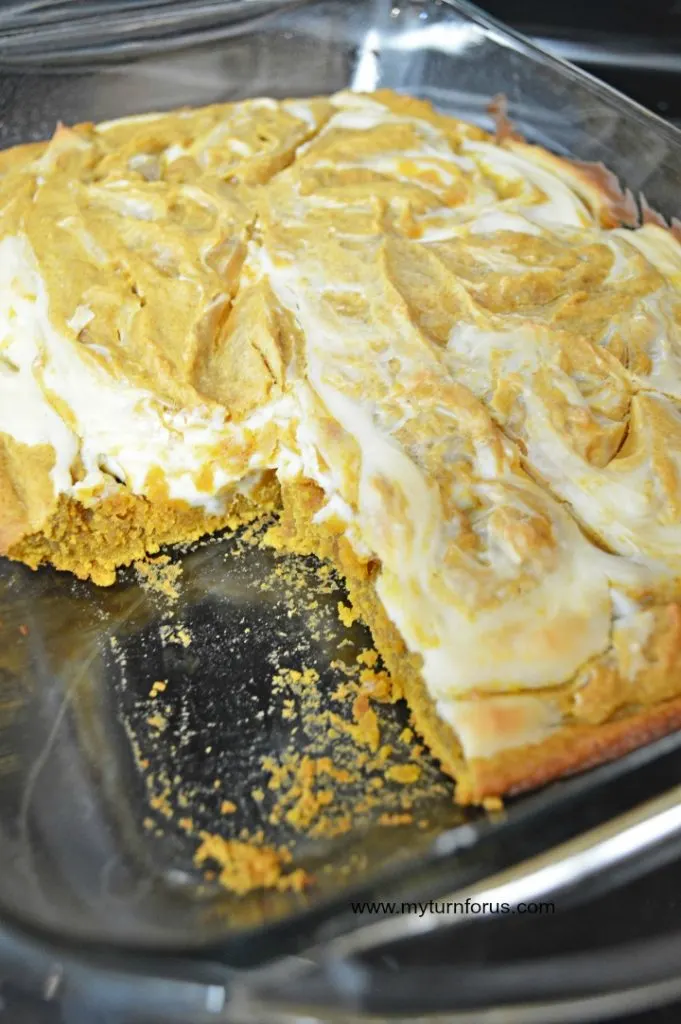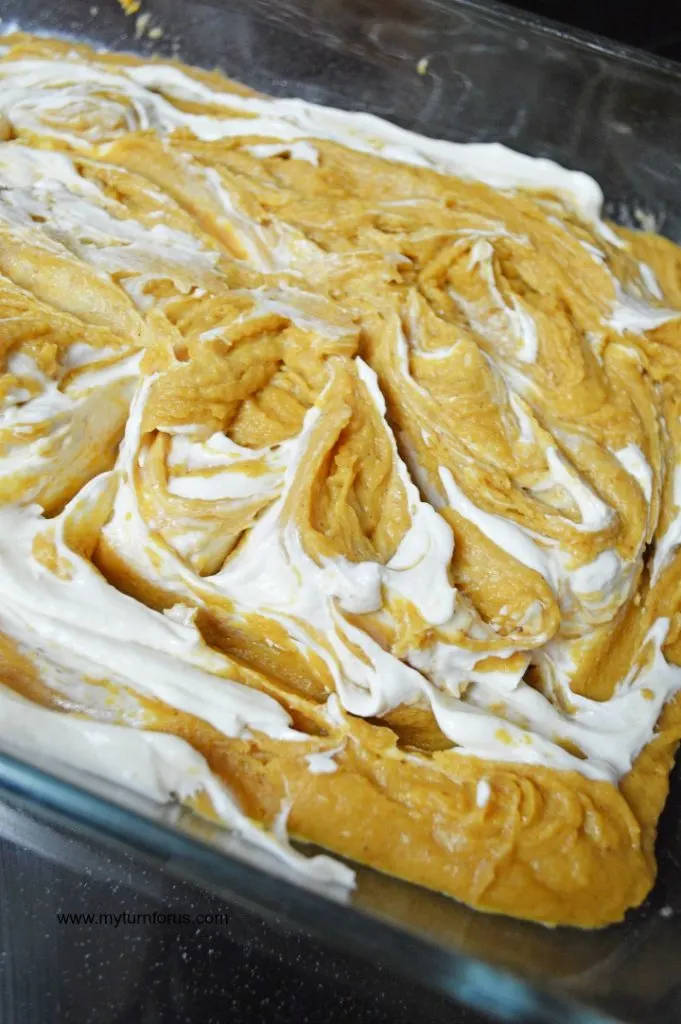 - Pour the remaining pumpkin bar mixture into the 9×13 pan, spreading it out evenly. Take the cheesecake mixture and drop by spoonfuls into the pumpkin. Gently spread the cheesecake mixture over top. Drop the remaining pumpkin mixture by spoonfuls over the cheesecake. Take a toothpick or a butter knife and gently swirl the cheesecake mixture and the pumpkin, careful not to over mix the two.