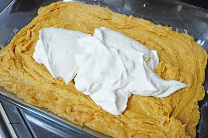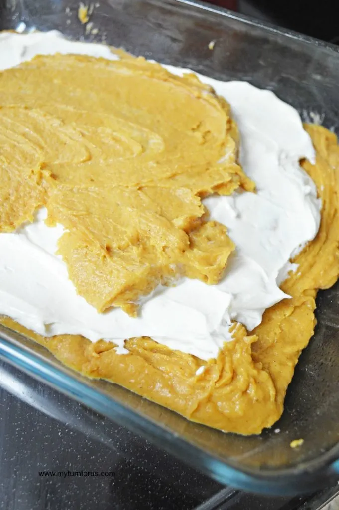 After spreading the cream cheese cheesecake mixture on top of the pumpkin, add the remaining pumpkin mixture.