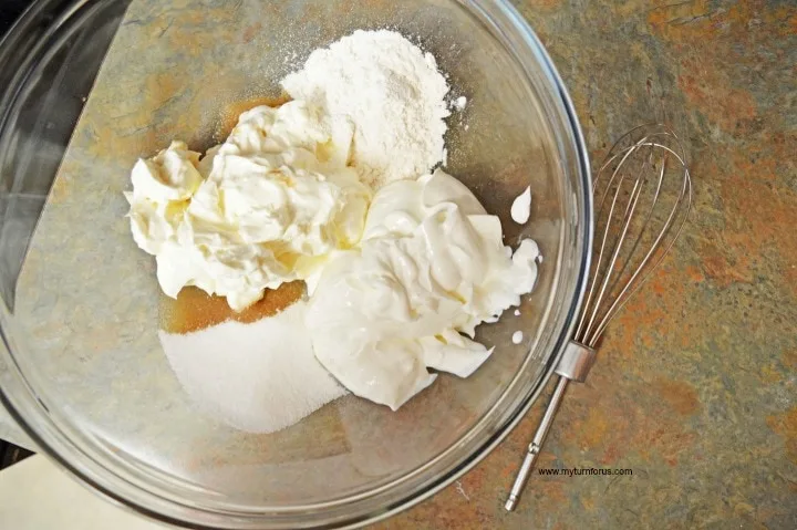 - Microwave 8 oz. cream cheese in a microwave-safe bowl on 15-second intervals until smooth. This only took 30 seconds total in my microwave, so (2) 15-second intervals, stirring between. In a medium bowl, whisk together cream cheese, sour cream, flour, sugar, vanilla, and salt. Set aside.