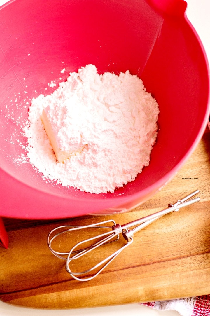 While the cupcakes are cooling, use an electric mixer to beat together the softened butter, powdered sugar and the milk until well-combined.