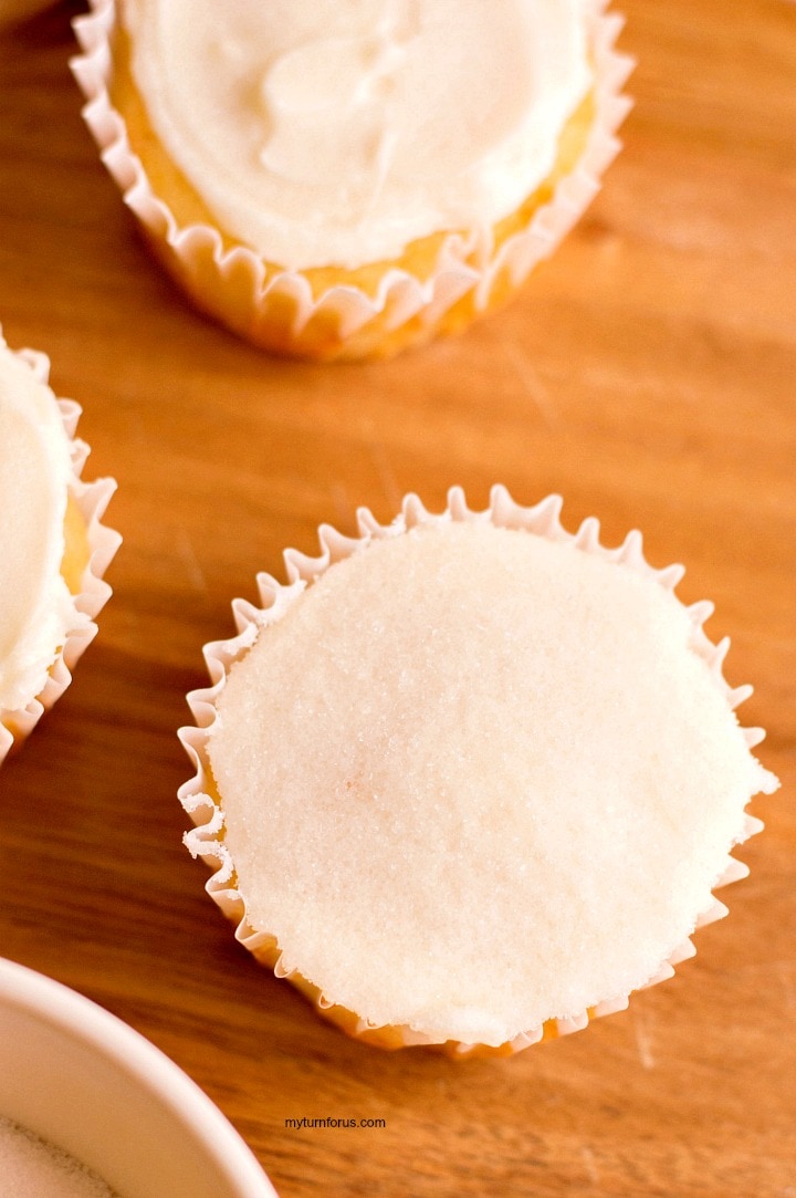Hold each cupcake over a bowl or plate to catch the excess and sprinkle on some of the Sparkling Sugar.   Or if you are using plain white sugar, you could simply dip each cupcake upside down in a bowl containing the sugar.