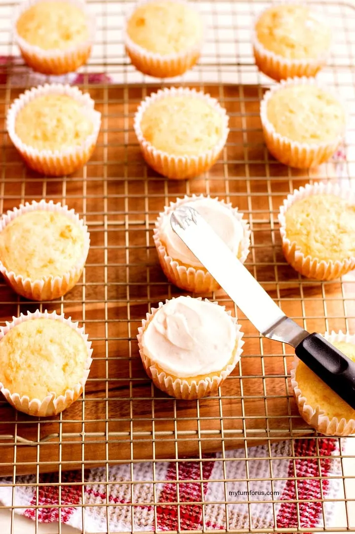 • Use an offset spatula to frost each cupcake with the buttercream frosting using all of it.