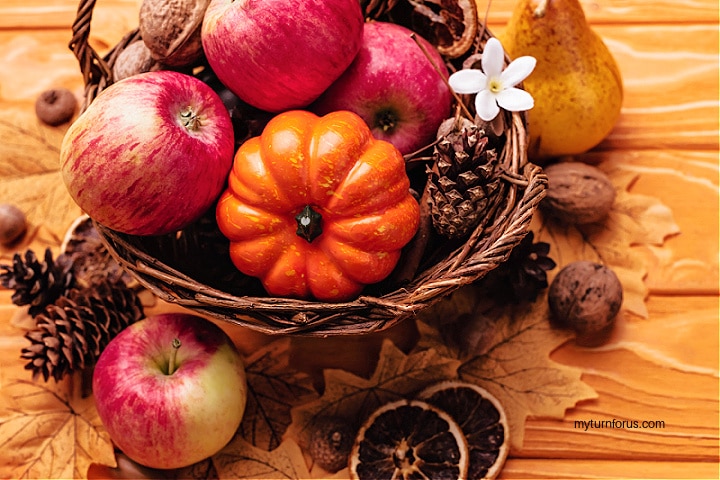 Next time you are at the grocery store grab some inexpensive apples, pears, pumpkins and squash to decorate your home. Add a few pinecones, nuts, leaves to create a basket of nature to refresh your home for the fall months.