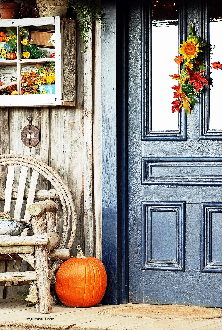 Tie a couple sprays of fall leaves, add sunflowers and hang it on your front door. Sometimes simple is best, for decorating for Fall on a budget .