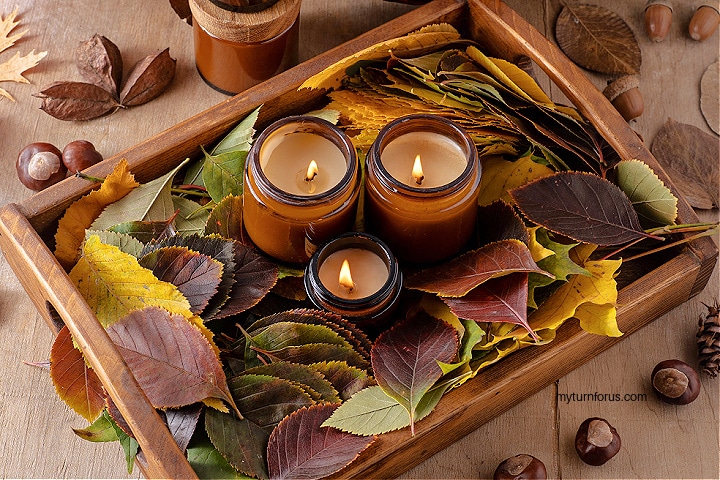 Fill tall glasses or  Mason jars with pillar candles surrounded by acorns, coffee beans or even candy corn. This will create a beautiful display for any table or shelf. Just make sure to keep your eyes on the candles when they are lit, you do not want them to burn down past the filler you used.  It’s never a good idea to have candles near dried fall leaves.