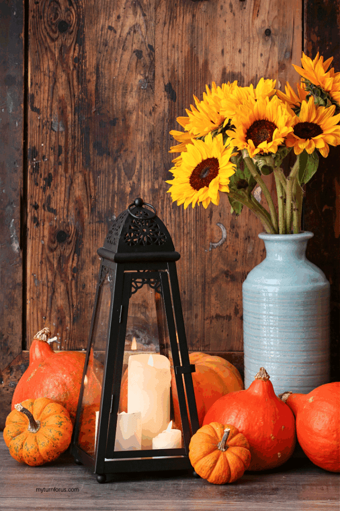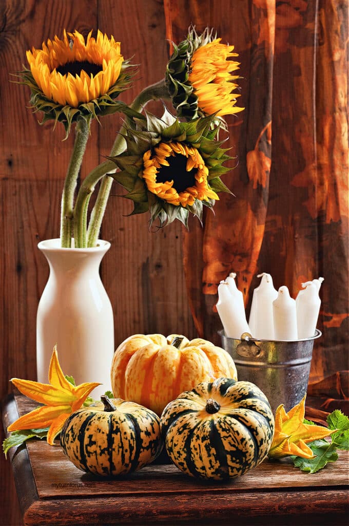 There are numerous easy ways to decorate your home for Fall.  Simple tricks that make your home comfy and gorgeous.  Adding unique candle holders and a variety of pumpkins or fall squashes. A vase of sunflowers always add country charm to your space.