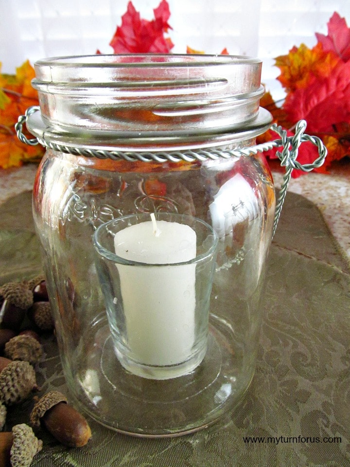 Another idea is to place either acorns or candy corn or mix around the outside of the votive candle holder. On this cute jar, we added a touch of tiny fall leaves for some fall color.